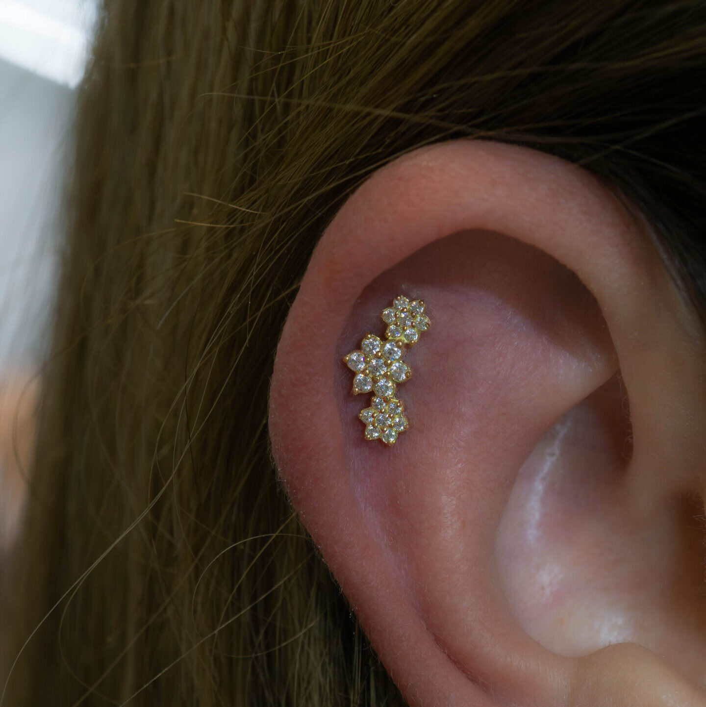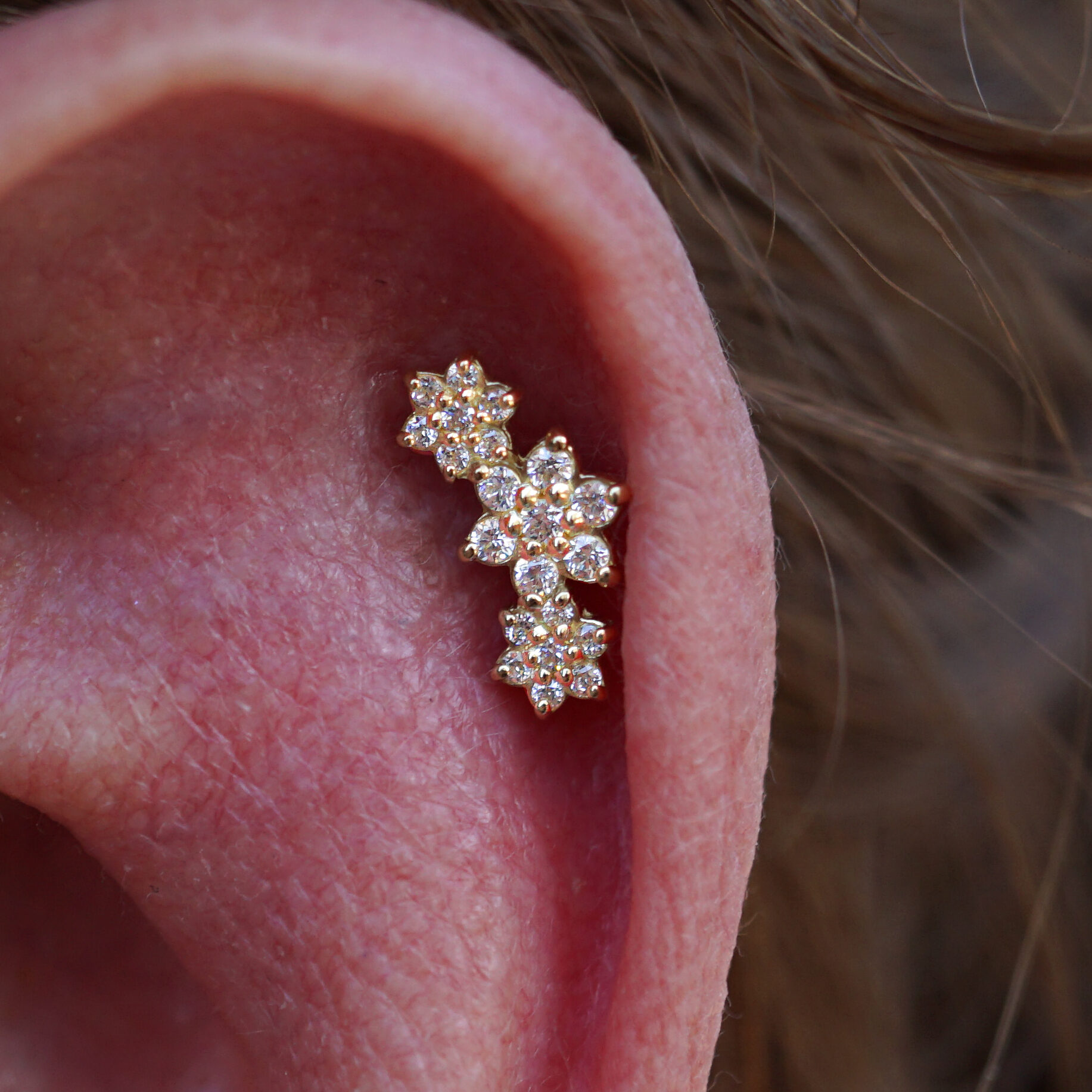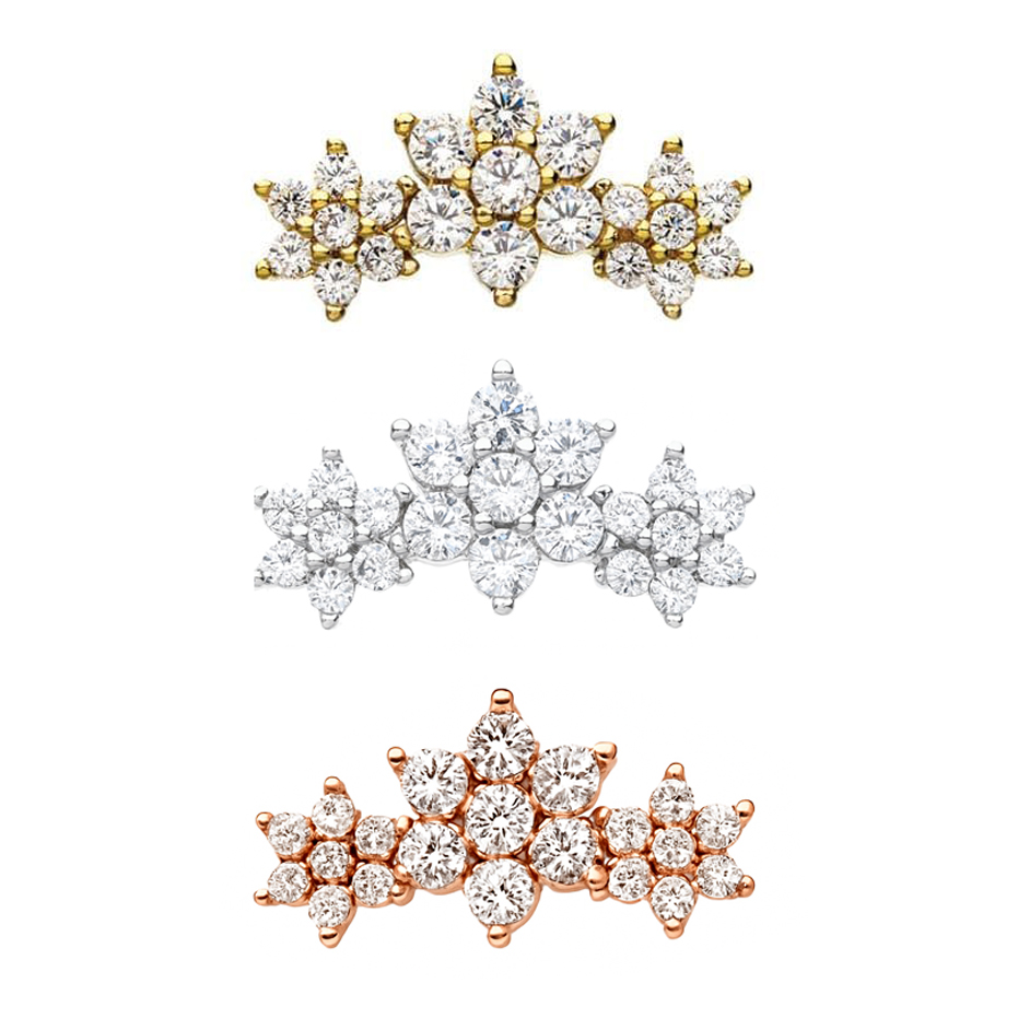 Ο τριπλός συνδυασμός λουλουδιών με Premium Zirconia δημιουργεί έντονη λάμψη και πολυτελές αποτέλεσμα που αναδεικνύει κάθε piercing.