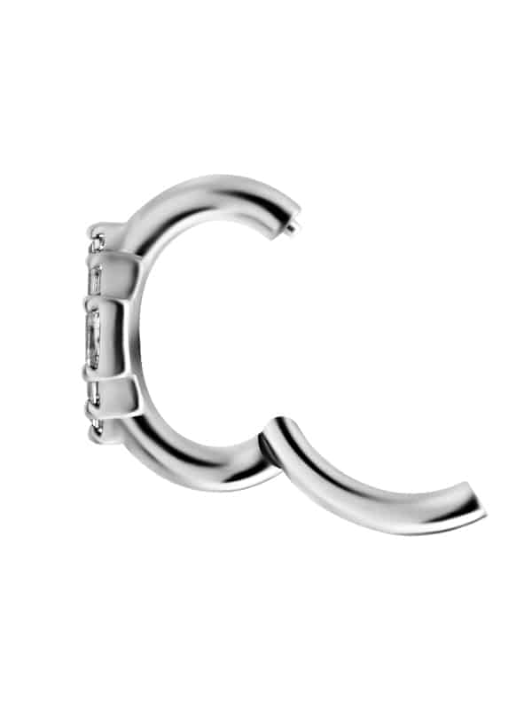 Το Baguette Cluster Belly Clicker είναι ένα εντυπωσιακό κόσμημα για τον αφαλό, σχεδιασμένο με ιδιαίτερο σχήμα από Baguette cut Zirconia πέτρες, τοποθετημένες προσεκτικά στο χέρι για απόλυτη λάμψη και συμμετρία. Η κομψή, γεωμετρική του διάταξη χαρίζει πολυτέλεια και καθαρότητα σε κάθε κίνηση, ενώ το Nickel Free Cobalt Chromium Alloy (CoCr NF) προσφέρει ανθεκτικότητα και υψηλή υποαλλεργική προστασία.