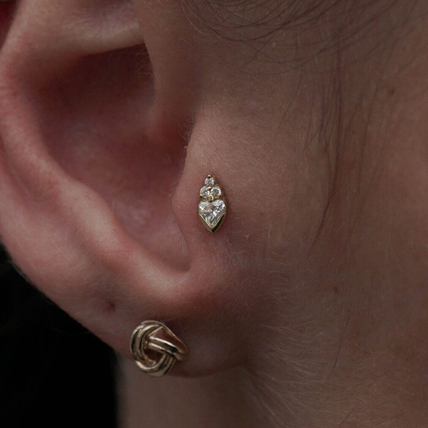 Ένα εντυπωσιακό κόσμημα σε σχήμα καρδιάς, στολισμένο με τρεις λαμπερές πέτρες Zirconia στην κορυφή του. Η κομψή και ρομαντική του σχεδίαση συνδυάζει πολυτέλεια και φινέτσα, αναδεικνύοντας κάθε piercing με διακριτική λάμψη. Χειροποίητα γυαλισμένο για τέλειο φινίρισμα.