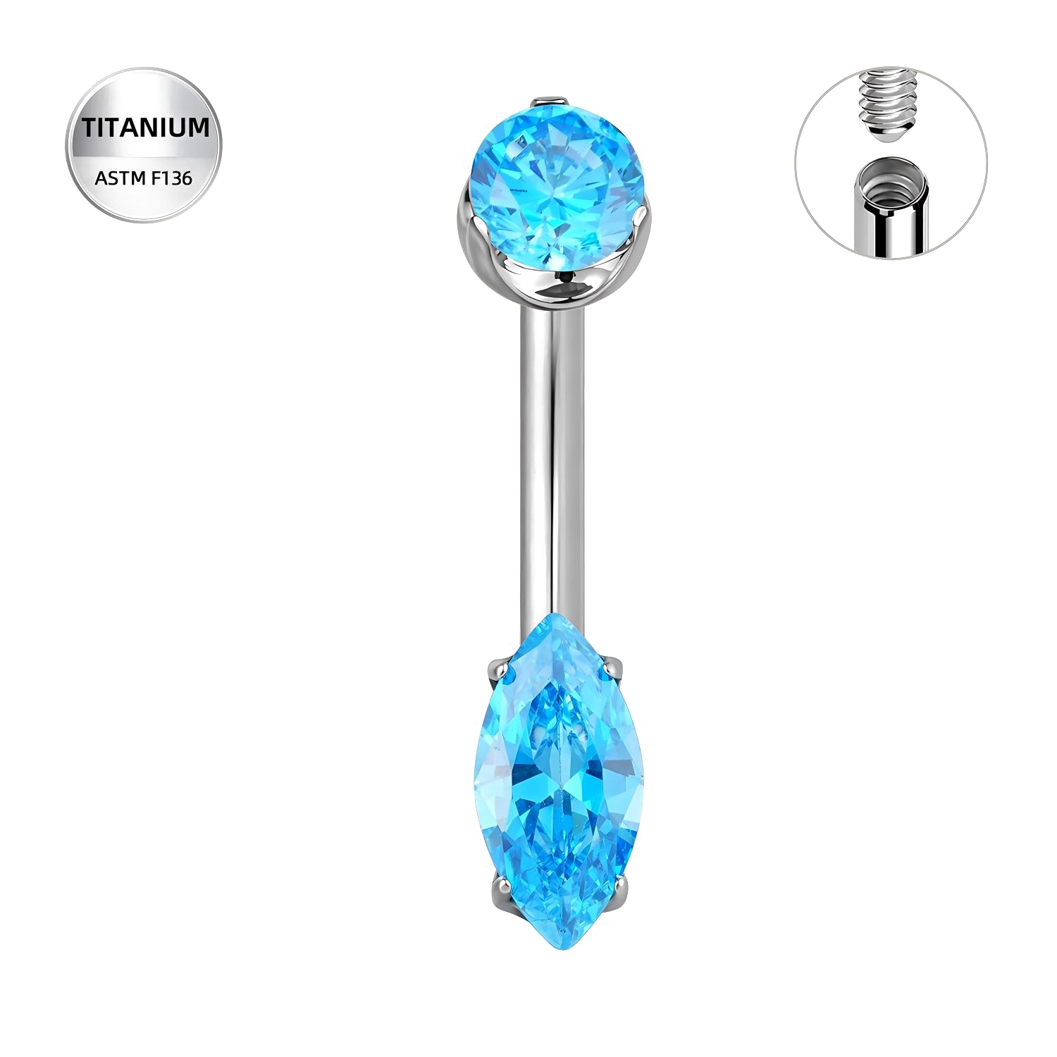 Ένα εξαιρετικά κομψό και ιδιαίτερο navel bar με διπλό τελείωμα: ένα λαμπερό round-cut πάνω και ένα εντυπωσιακό marquise-cut στο κάτω μέρος. Το icy–blue χρώμα του δίνει καθαρή, φωτεινή λάμψη και δημιουργεί ένα luxury, eye-catching αποτέλεσμα που ξεχωρίζει σε κάθε κίνηση. Ιδανικό για όσους θέλουν minimal γραμμή αλλά με premium, statement εμφάνιση.