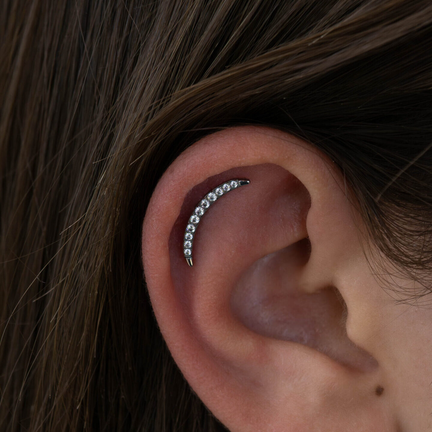 Ένα εκλεπτυσμένο κομμάτι με διαχρονικό design. Το 9 Cluster Metal Edge διαθέτει μια καμπυλοτή γραμμή από Cubic Zirconia, δεμένα προσεκτικά σε Titanium F-136 implant grade. Ιδανικό για Helix ή Conch piercing, χαρίζει μια έντονη λάμψη στο αυτί.