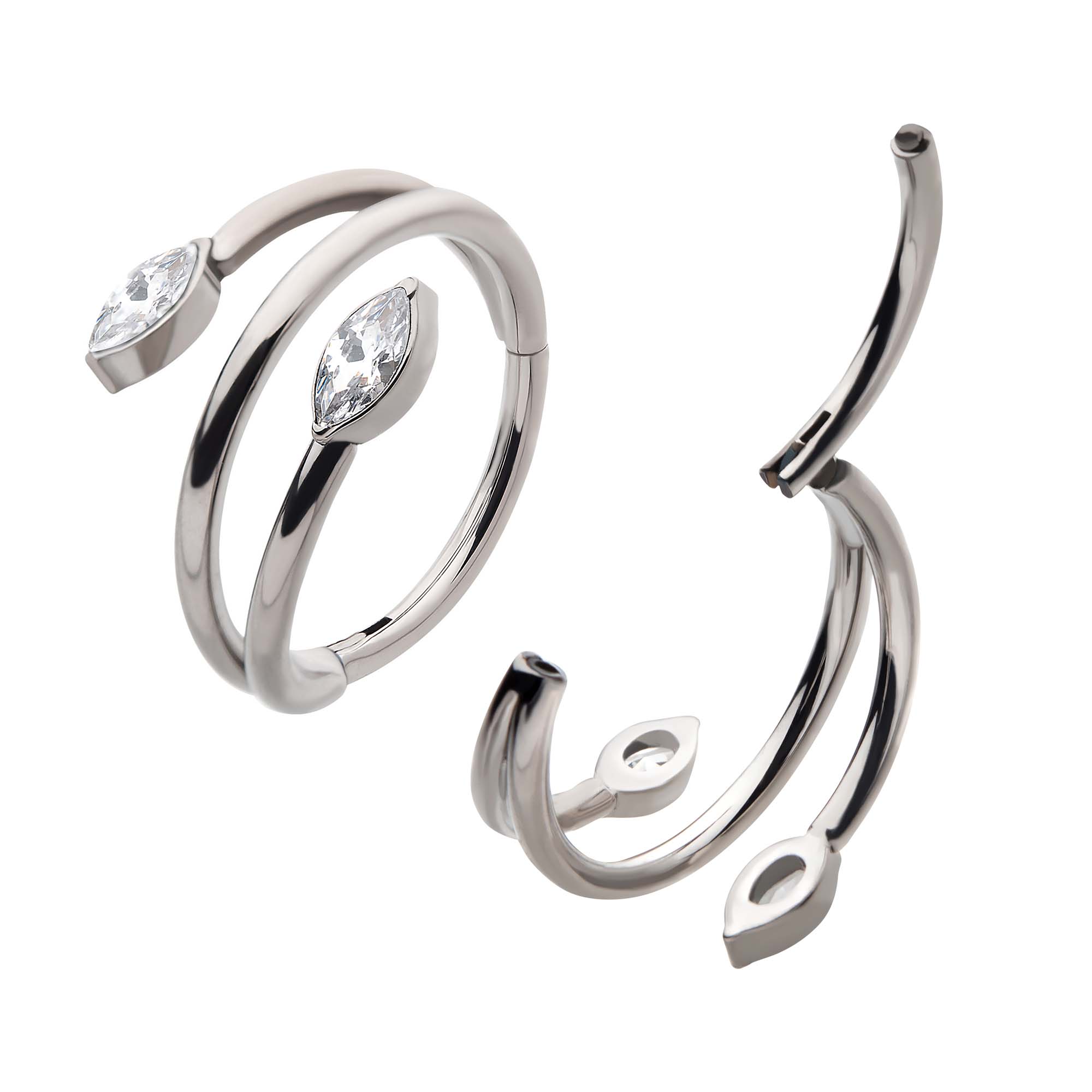 Titanium Double Ended Twist Side Facing Hinged Segment Clicker with Marquise CZ.?Manufactured from High Polish Implant Grade Titanium (Ti-6AL-4V-ELI ASTM F136).Create the illusion of multiple piercings in one hole with these Two Clear Cubic Zirconia Marquise twisting around in your choice of two sizes in this Titanium twisted hinge segment clicker.