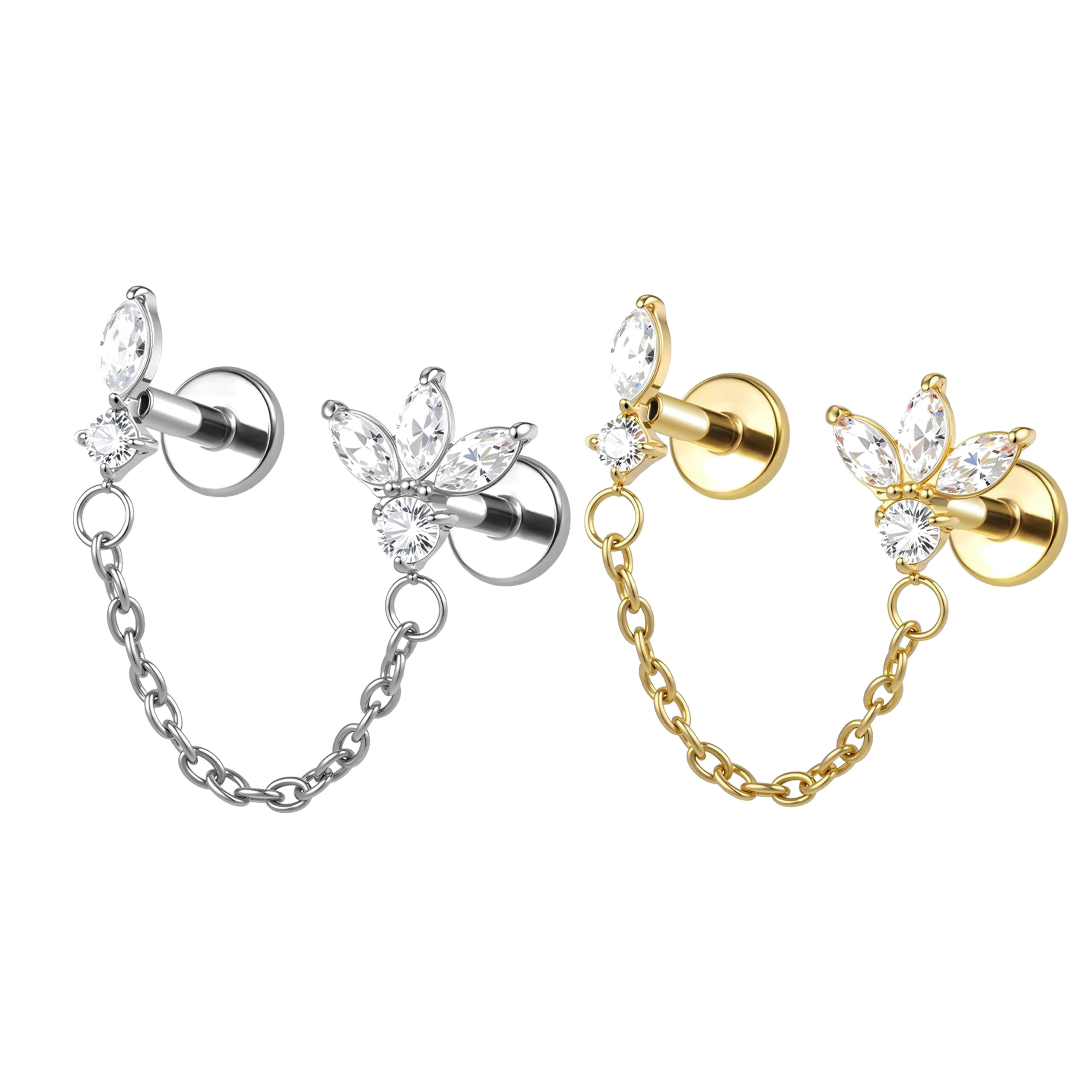 Διπλό σχέδιο με cubic zirconia πέτρες σε marquise και round cuts, ενωμένα με λεπτή αλυσίδα για extra κίνηση και στιλ. Κατασκευασμένο από implant grade τιτάνιο F-136, προσφέρει εντυπωσιακό αποτέλεσμα σε κάθε curated ear.