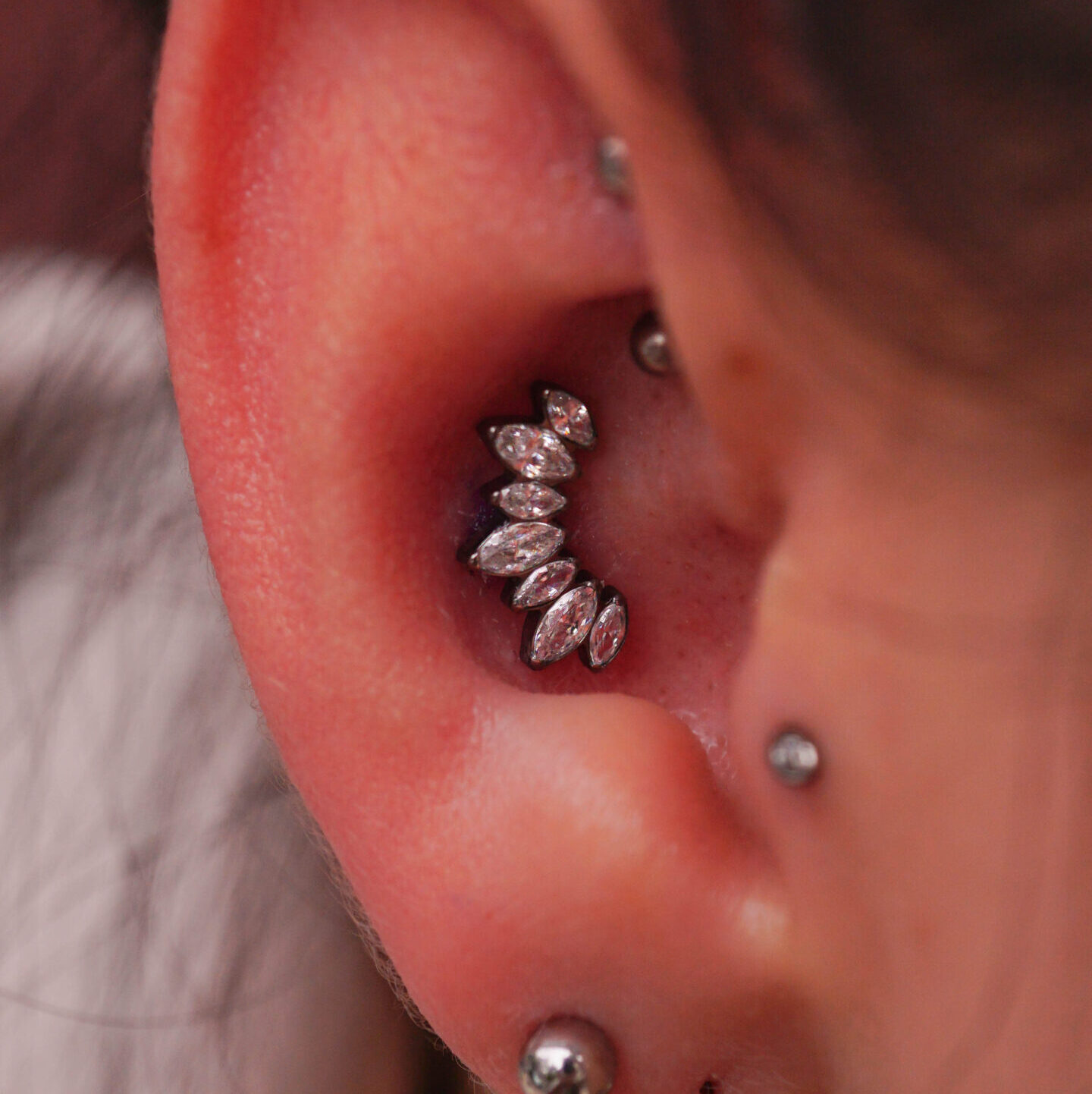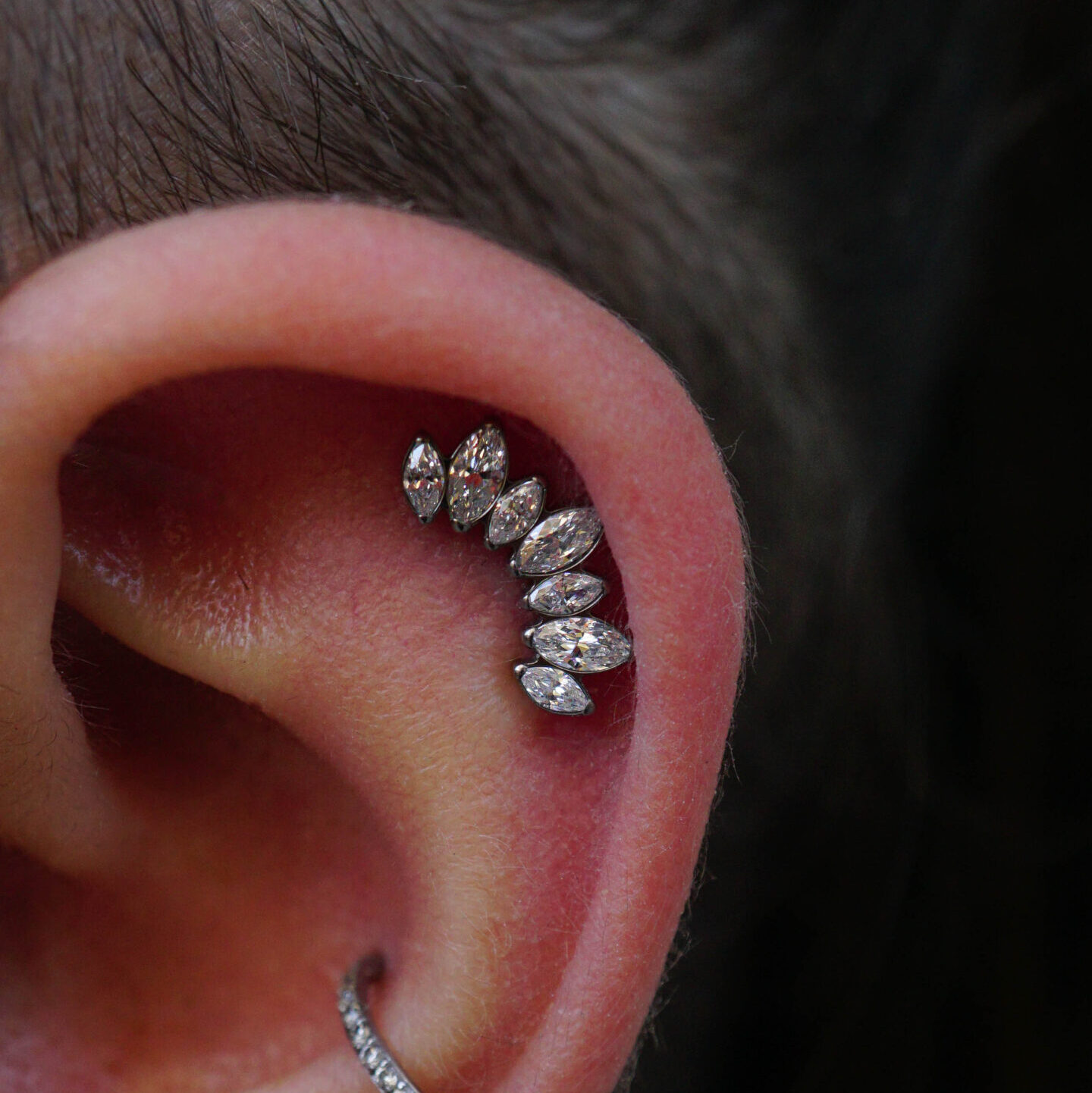Graceful and bright, this 7-stone fan top features marquise-cut clear CZ arranged in a balanced arc and prong-set to maximize sparkle. Precision-milled from High-Polish Implant Grade Titanium (Ti-6Al-4V-ELI ASTM F136), it offers exceptional durability and a clean, refined look. The internally threaded construction provides a smooth, secure connection.