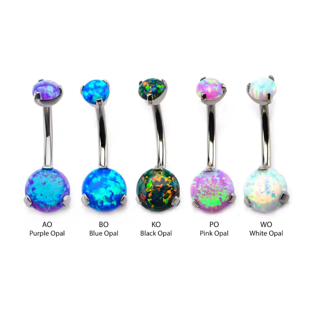 Ένα luxurious navel bar με prong-set opal πέτρες που λάμπουν από κάθε γωνία. Διατίθεται σε πολλά εντυπωσιακά χρώματα — από electric blue μέχρι vivid pink, deep midnight black opal και classic white opal — ώστε να μπορείς να διαλέξεις ακριβώς αυτό που ταιριάζει στο στυλ σου. Ένα premium, καθημερινό κόσμημα με υψηλή αντοχή και άνεση χάρη στο implant grade titanium.