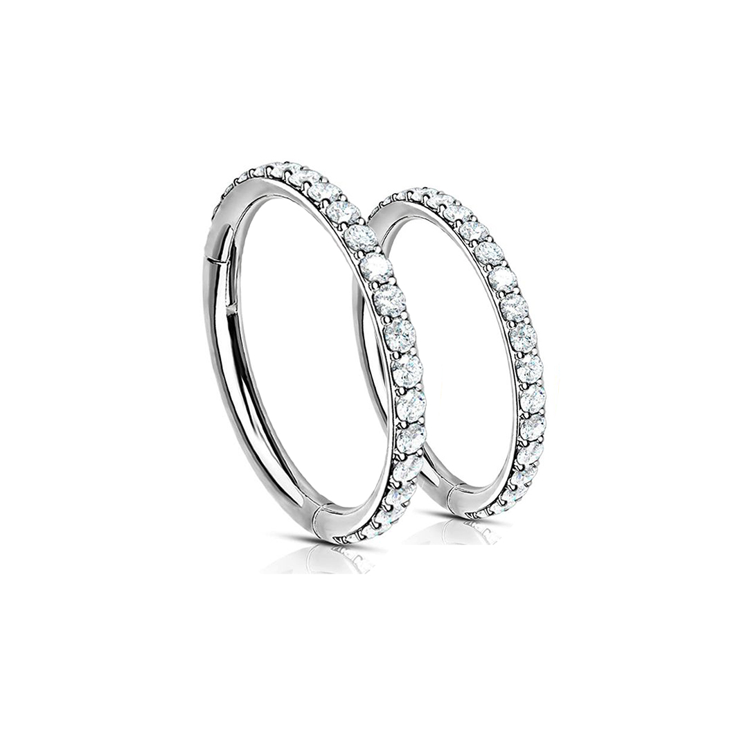 Κομψός και διαχρονικός κρίκος με pavé cubic zirconia, κατασκευασμένος από implant grade τιτάνιο F-136. Το ασφαλές hinged clicker system εξασφαλίζει εύκολη τοποθέτηση και σταθερό κλείδωμα, χωρίς να τραυματίζει το δέρμα.