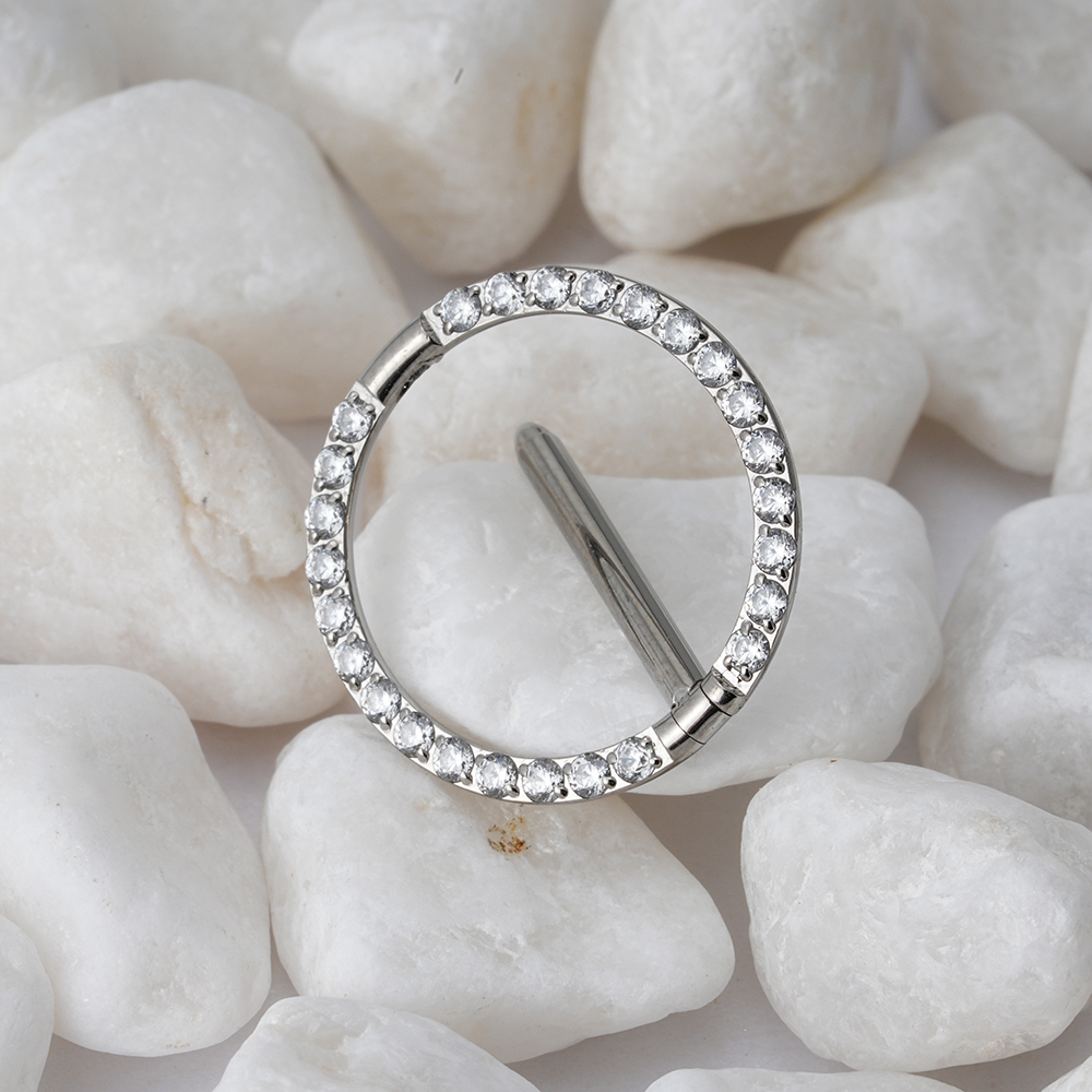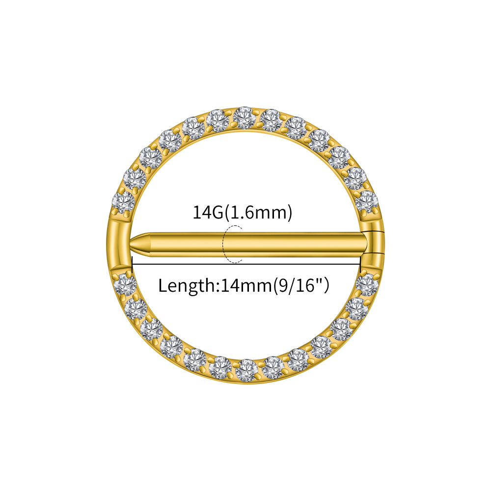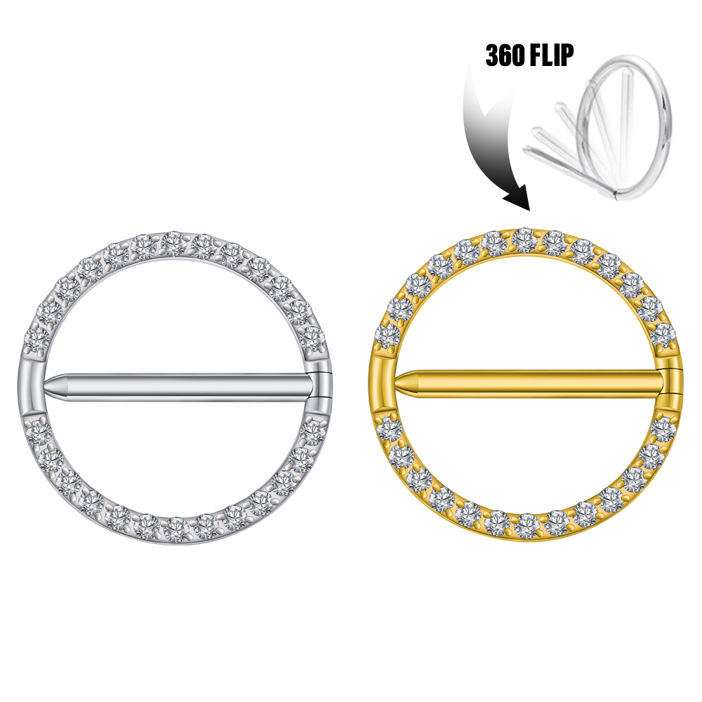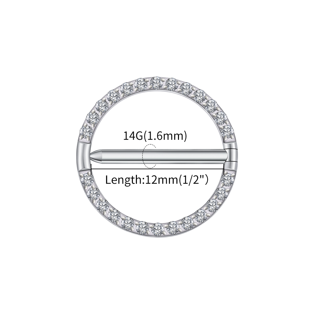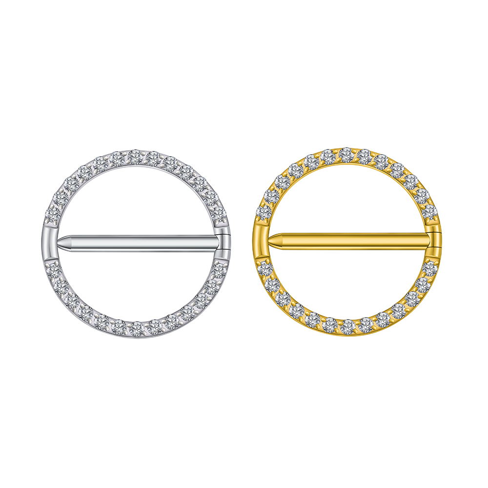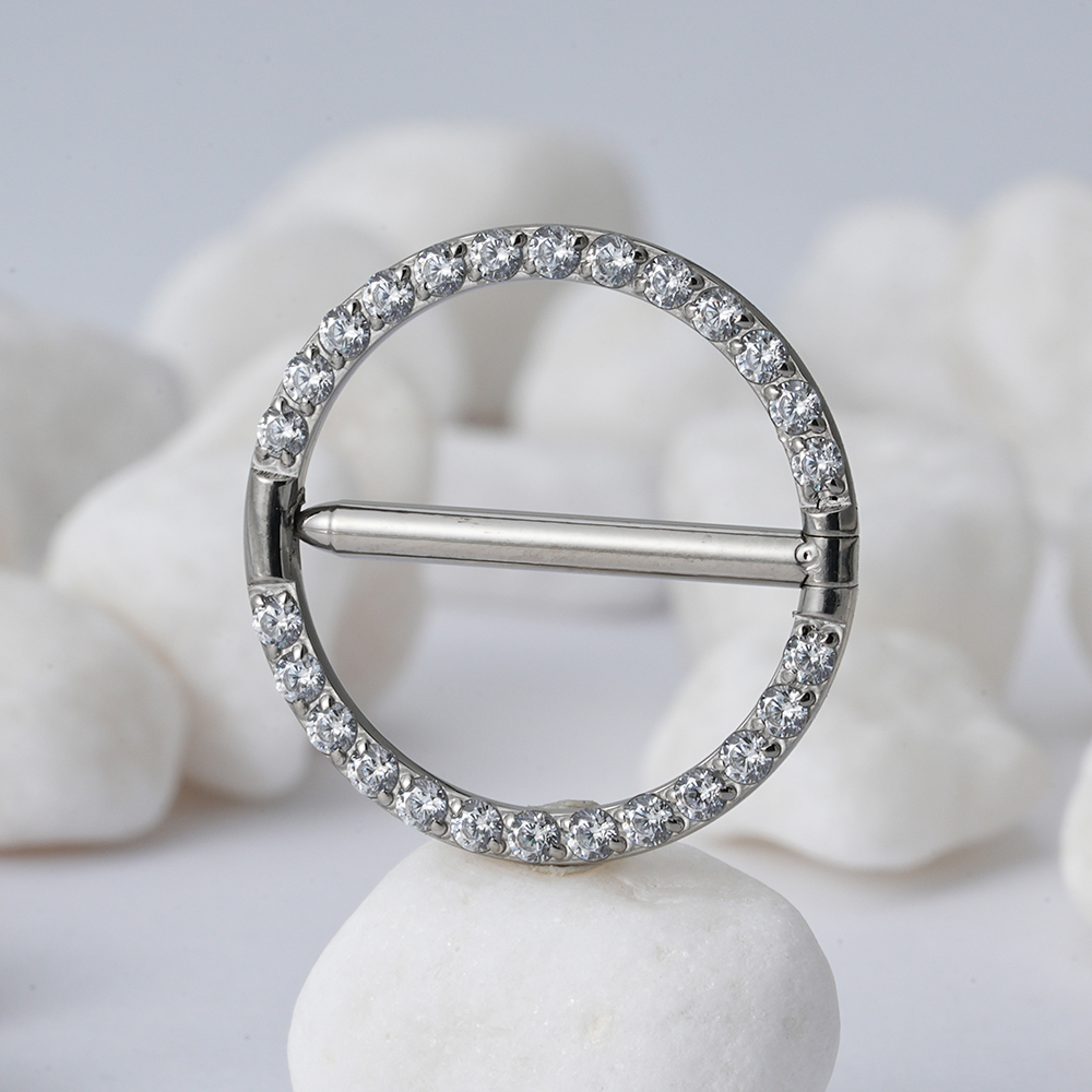A perfectly round halo of handset stones with a clean horizontal bar — a bright, modern ring for the nipple.
