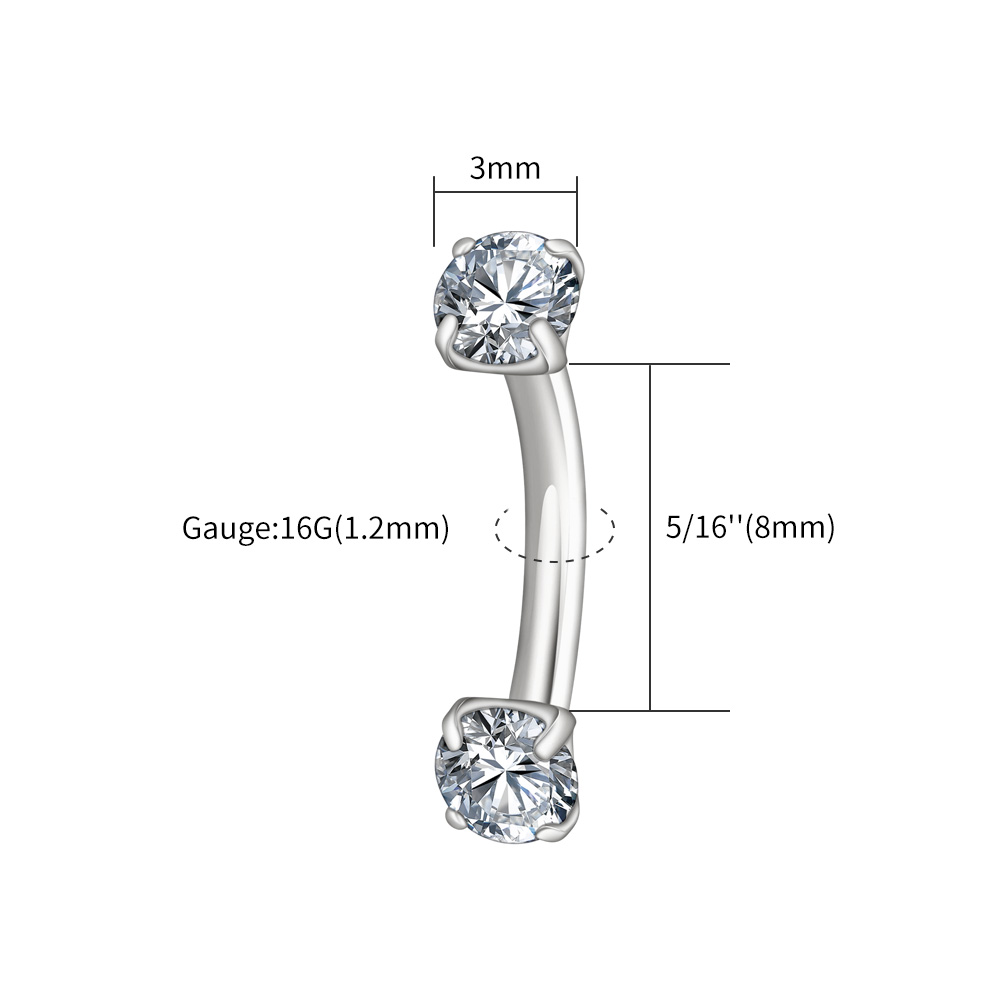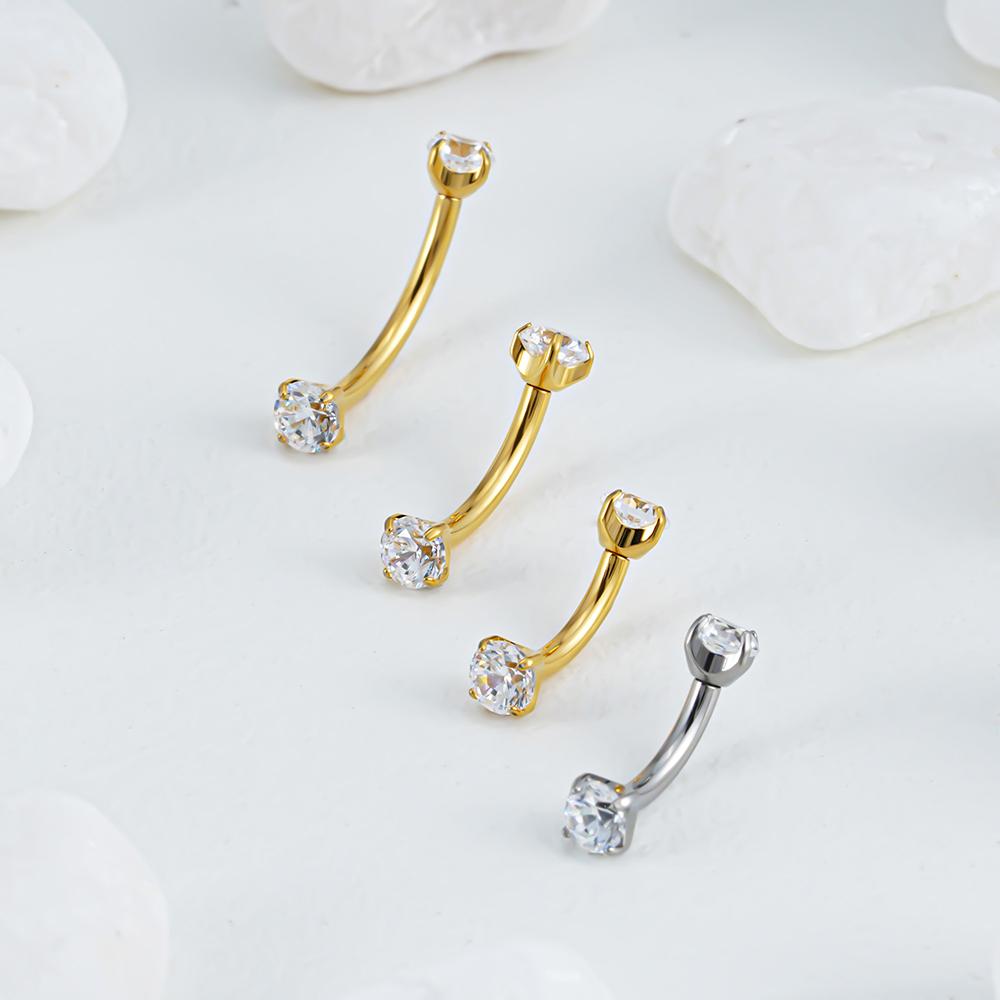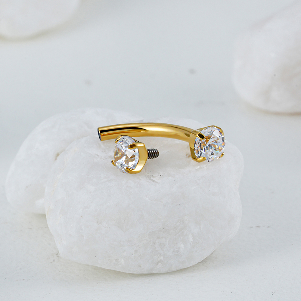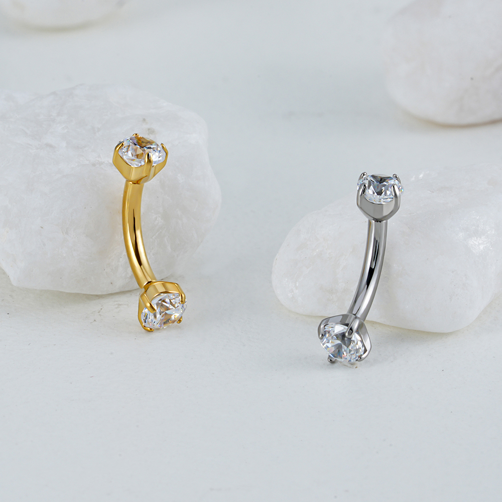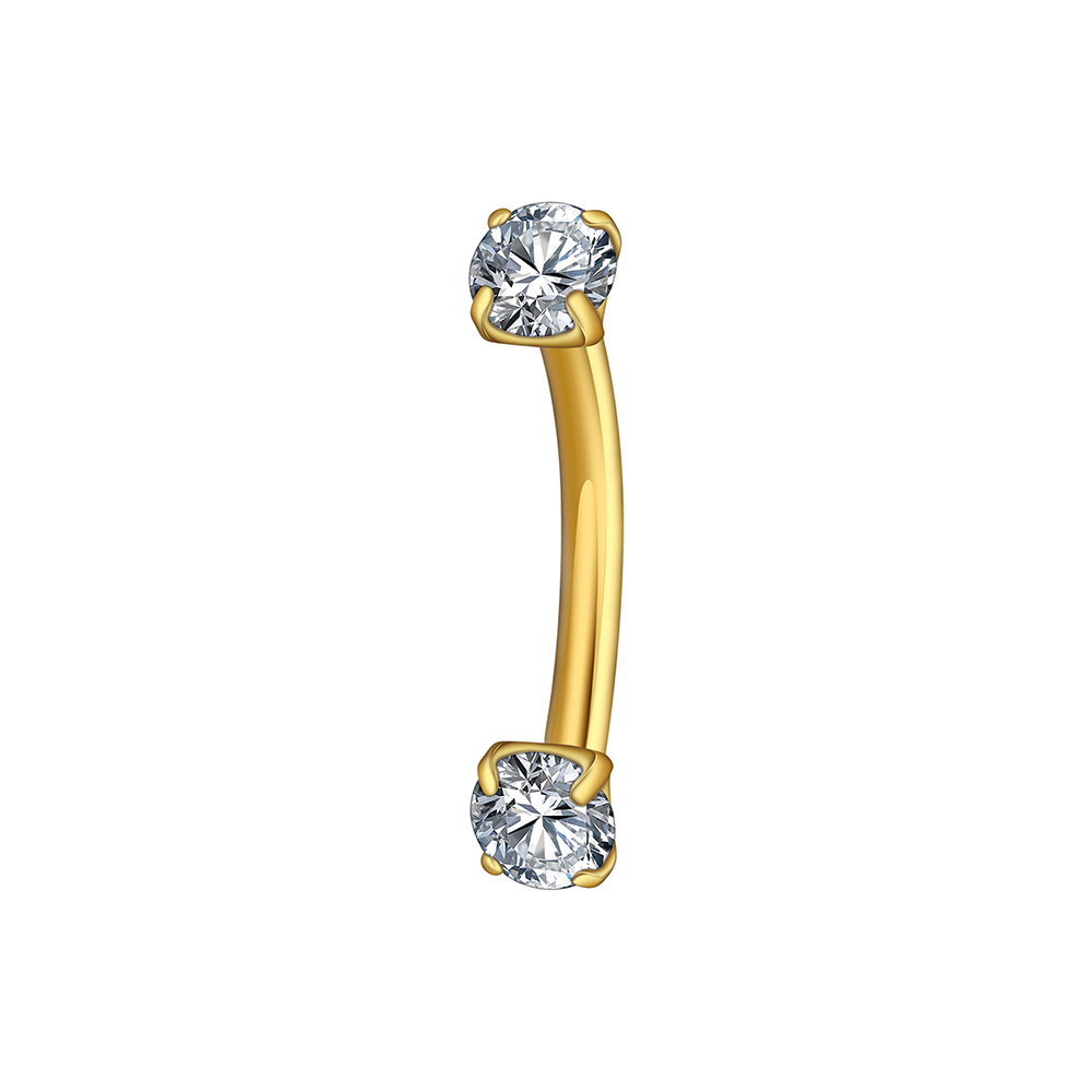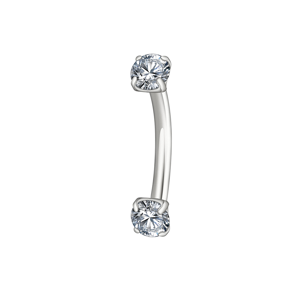 Minimal and bright: two prong-set stones crown a slim curved bar for clean, high-sparkle styling.