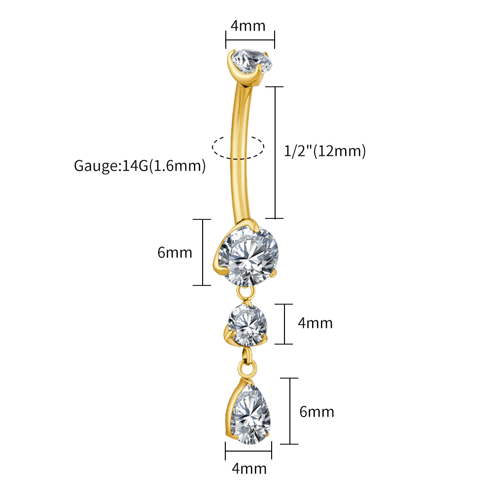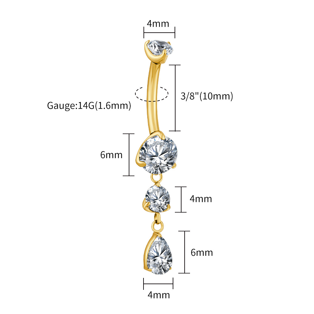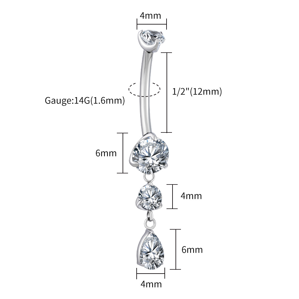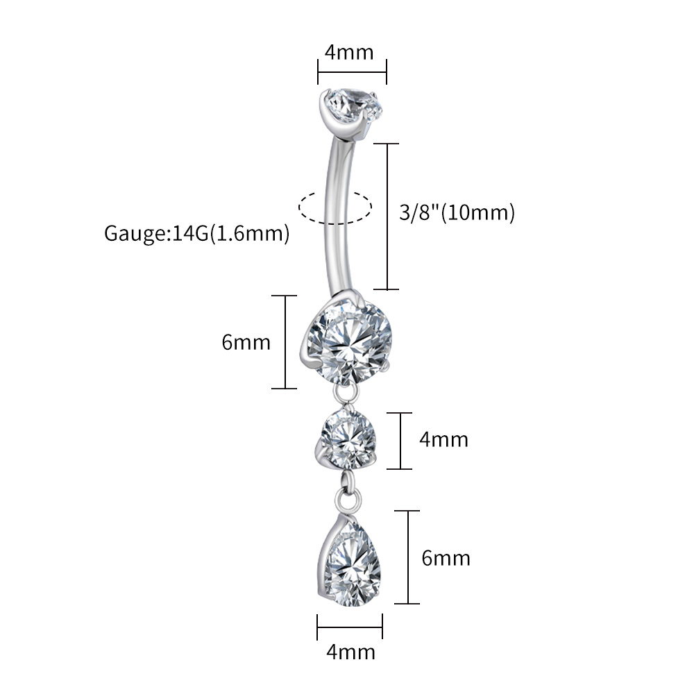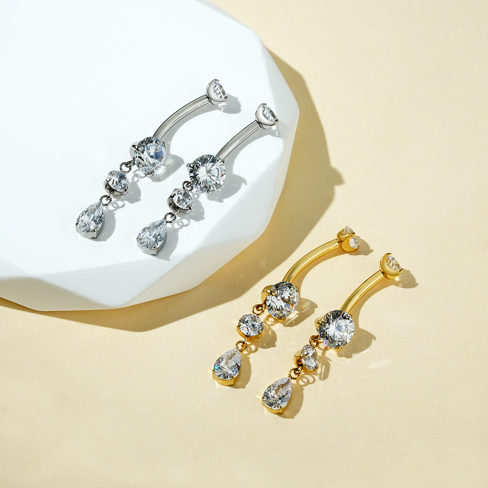 Ένα εντυπωσιακό κρεμαστό navel bar με τρεις pear-cut πέτρες που «τρέχουν» σαν καταρράκτης πάνω στην κοιλιά και φωτίζουν κάθε κίνηση. Το signature best-seller κόσμημα για τον αφαλό, ιδανικό για όσους θέλουν πραγματικά statement λάμψη χωρίς να θυσιάζουν την άνεση και την ασφάλεια του implant grade τιτανίου.