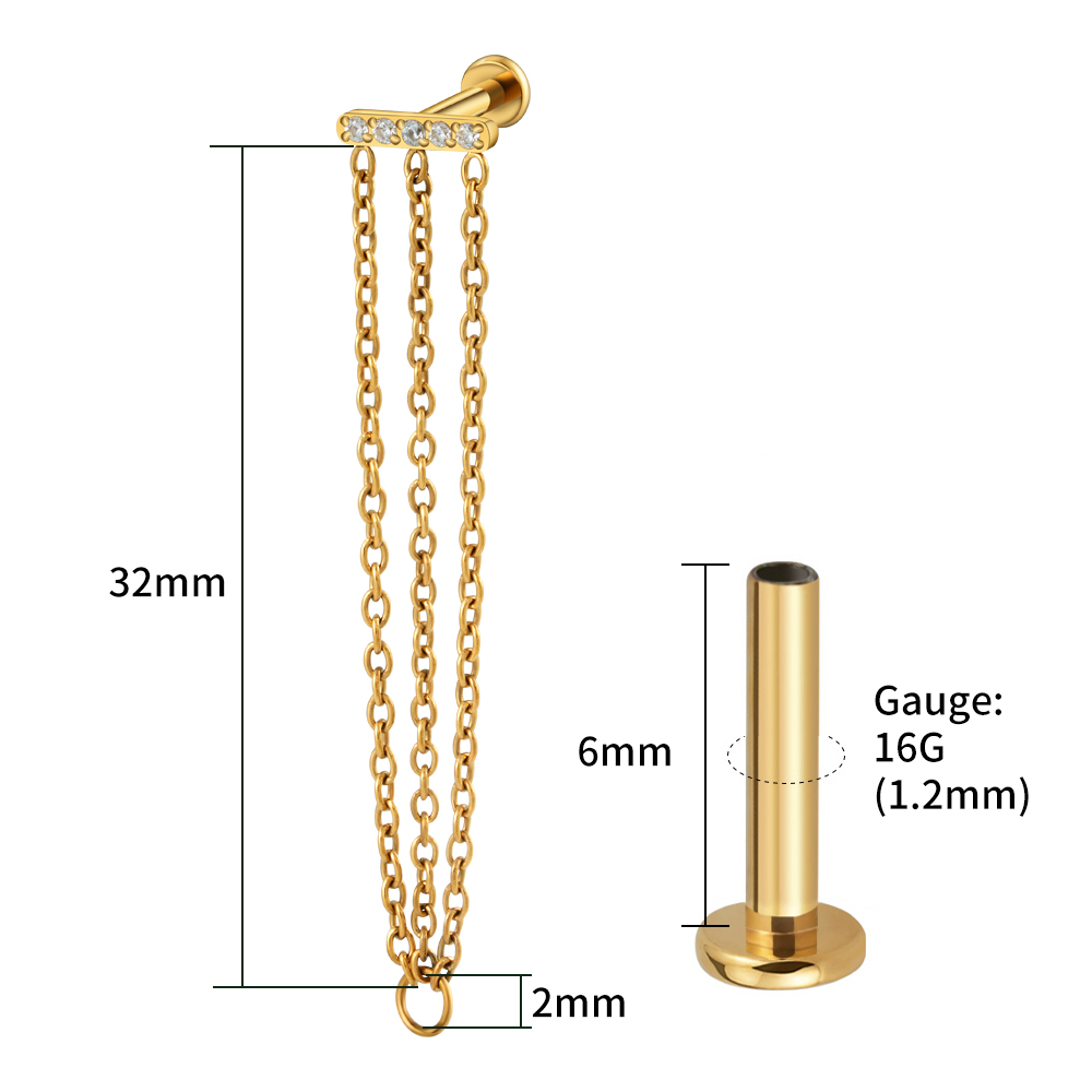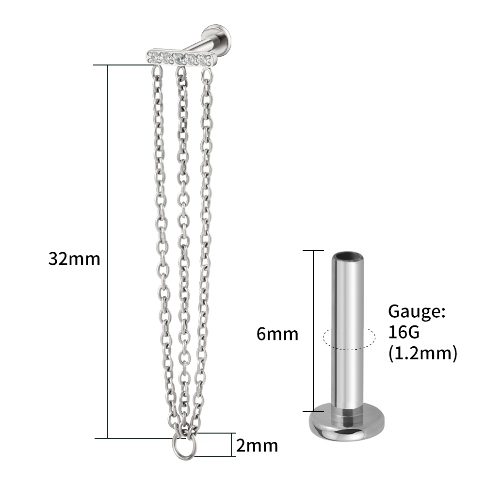 A bar of bright stones anchors three fine chains for dramatic, feather-light movement. Designed to sit flush on a flat back, it pairs beautifully in lobe and cartilage projects. The titanium top can be anodized to gold tone or additional colors.