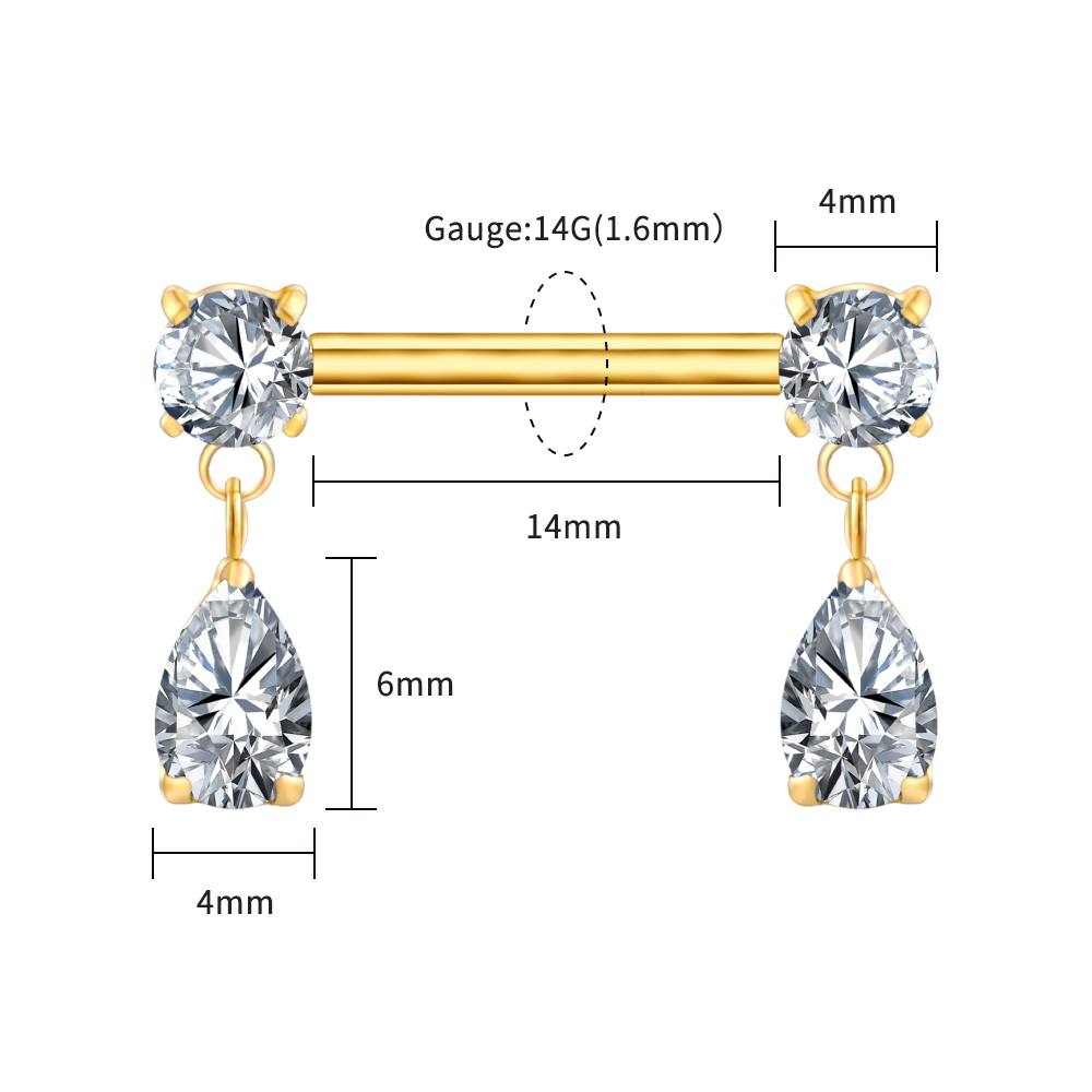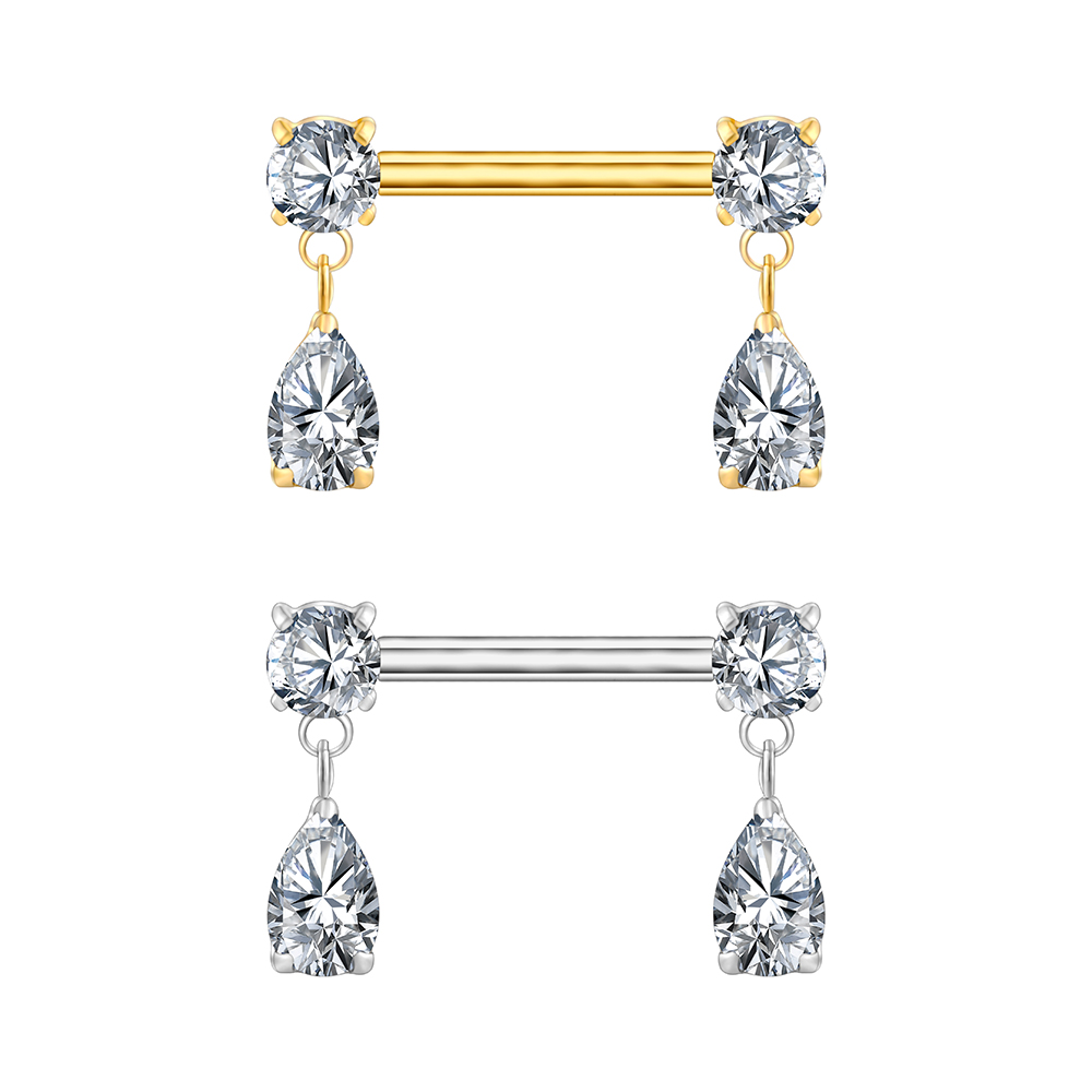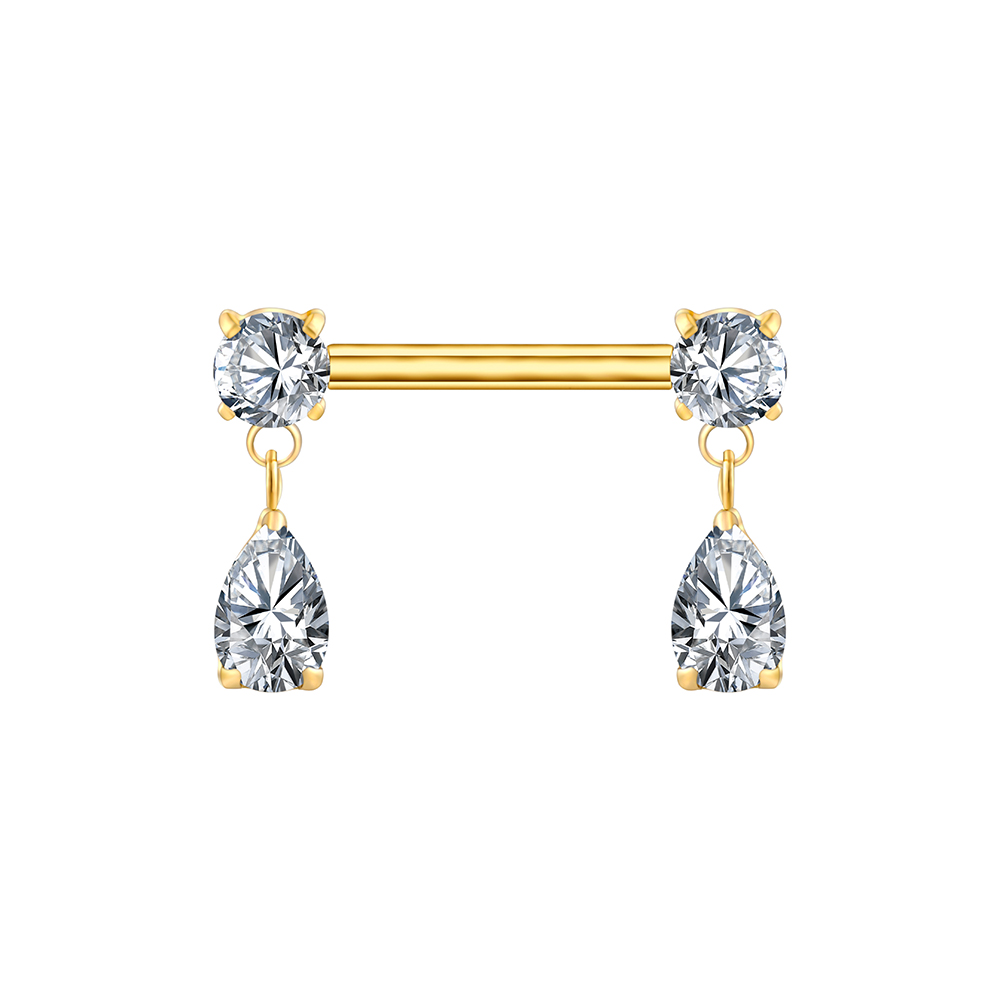 Elegant pear-cut drops suspended from luminous round studs create a refined, symmetrical nipple bar.